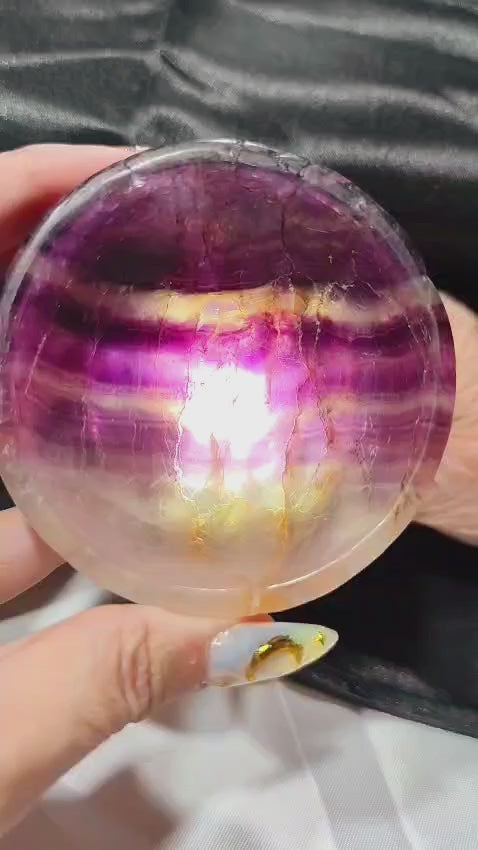 Coloca velas de té o pequeñas velas rituales dentro del cuenco. La luz de la vela a través de la Fluorita crea destellos mágicos violetas. 🔥💜