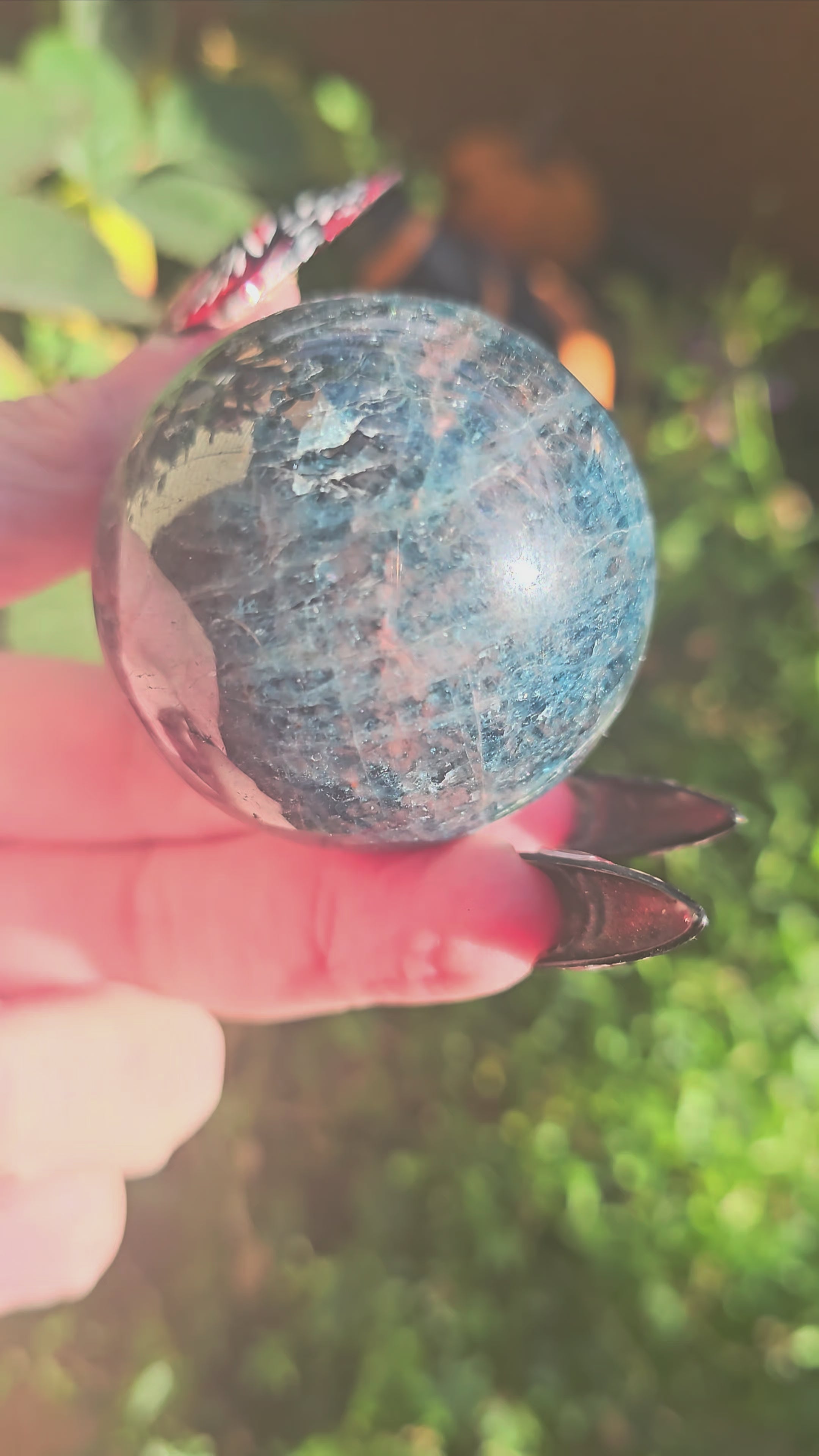 Esta esfera ha sido pulida hasta alcanzar un brillo super brillante que resalta la belleza natural del apatito. Su acabado vítreo refleja la luz de manera espectacular, creando un efecto hipnótico y elevando cualquier espacio donde se coloque.